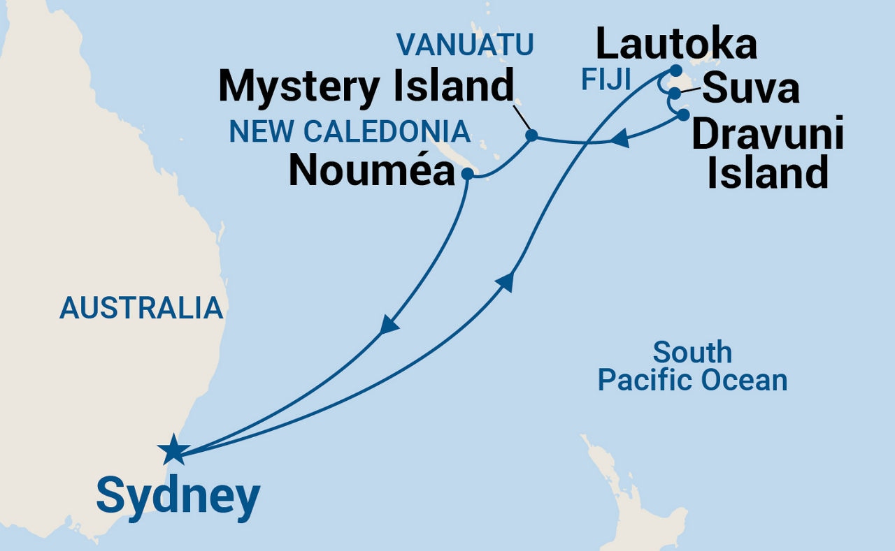 Sydney, At Sea, At Sea, At Sea, At Sea, Suva, Dravuni Island, Lautoka, At Sea, Mystery Island, Noumea, At Sea, At Sea, Sydney.